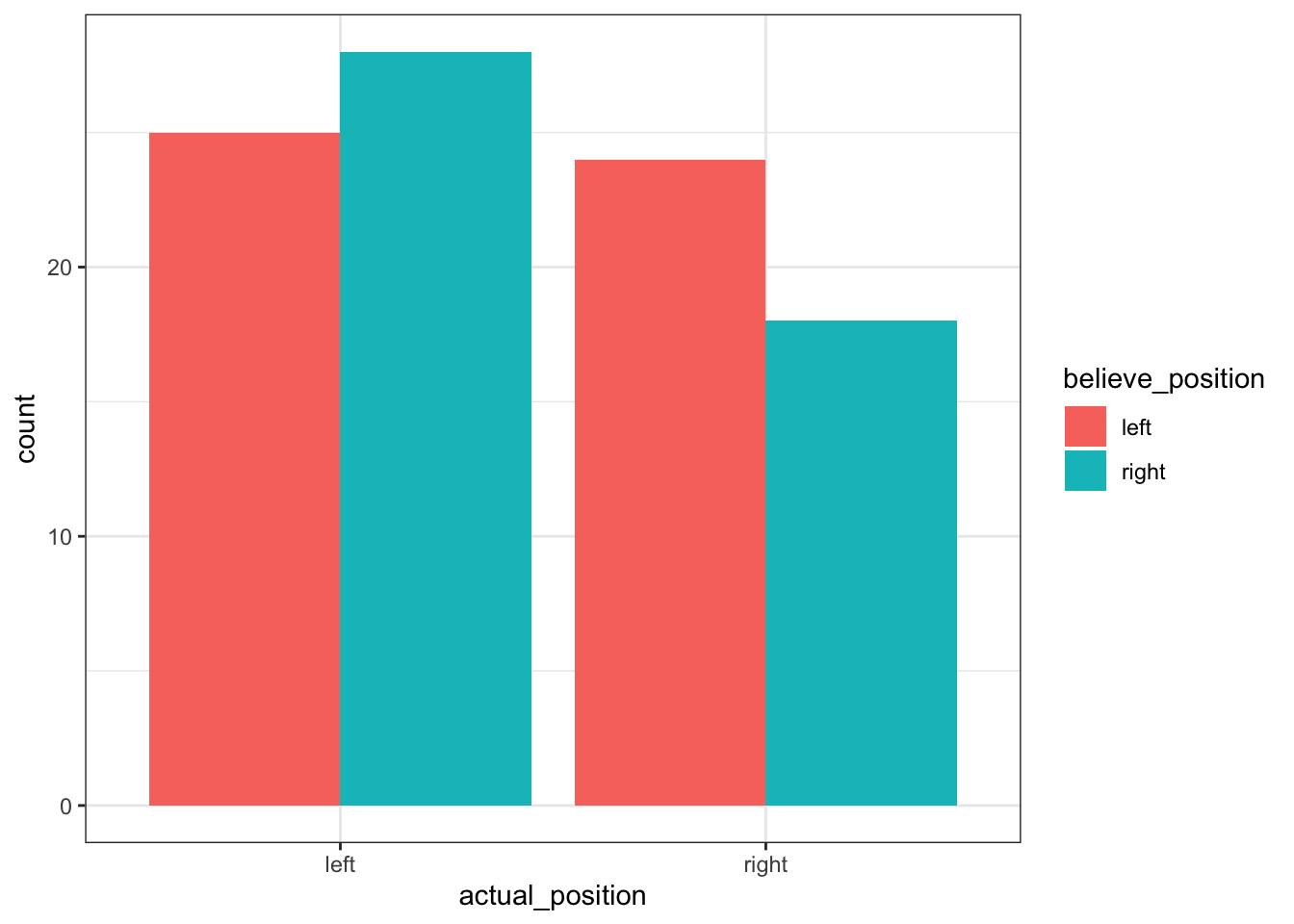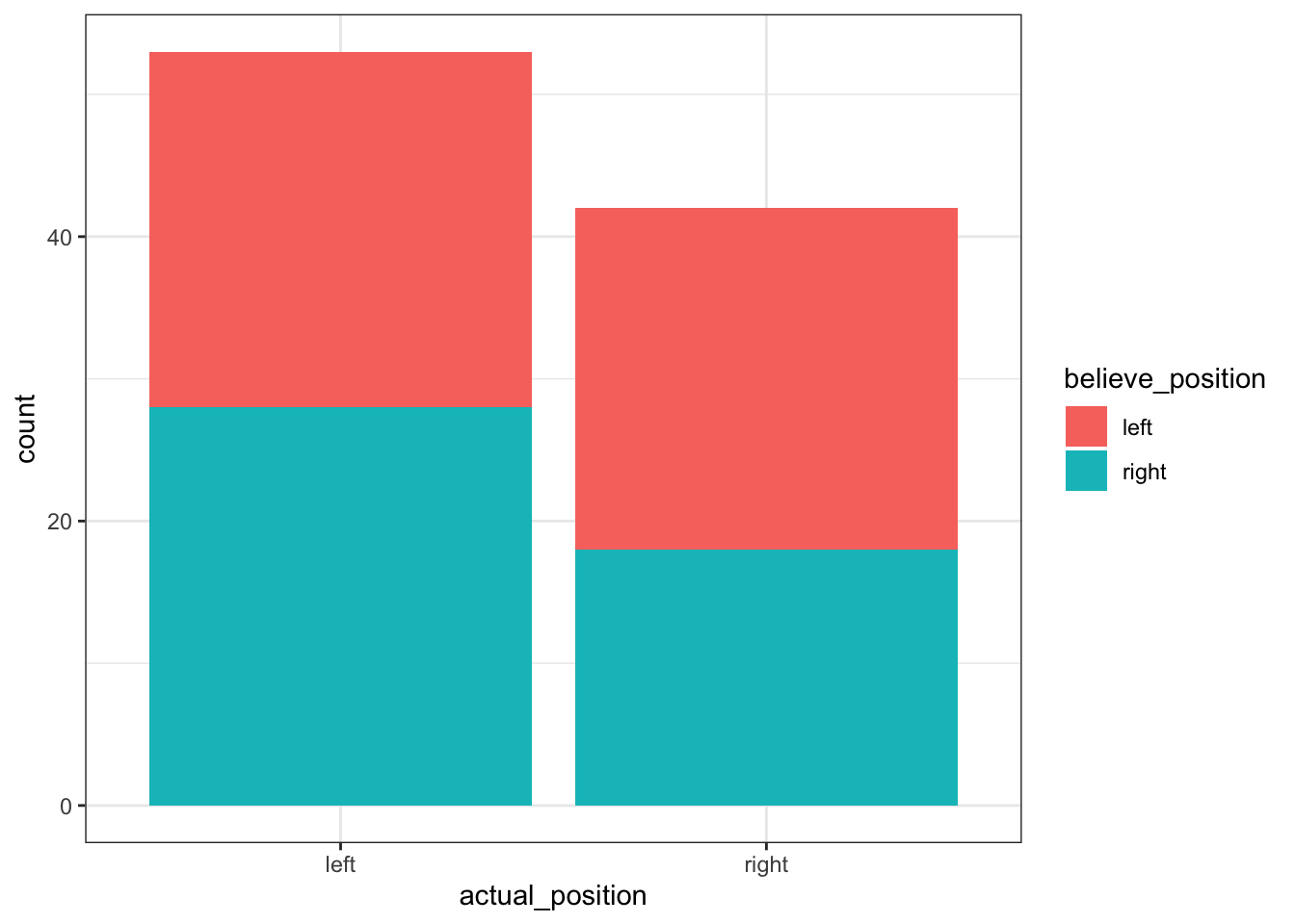 Hm…that doesn’t look quite right. Here, the fill argument has filled the bars with different colours. This doesn’t make comparison very easy, so instead I want to split the two bars into four, based on their value of the second variable, believe_position. In other words, I want geom_bar to draw the bars in different positions.